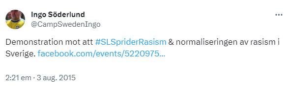Inte minst har han agiterat mot Sverigedemokraterna. Sensommaren 2015 uppmanar han till demonstration mot Storstockholms lokaltrafik i protest mot att partiet får annonsera i tunnelbanan. Han syns flera gånger på bild tillsammans med före detta statsministern Fredrik Reinfeldt (M).