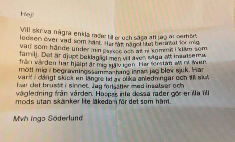 Några veckor efter händelsen dimper det ner ett brev hemma hos den barnfamilj som Ingo Söderlund sexofredat där han ber om ursäkt för sitt beteende.