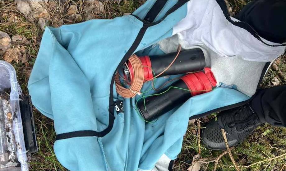Men vittnen har sett honom gå ut i ett skogsparti för att gömma det inlindade föremålet. Och när polisen kontrollerar gömstället visar det sig att det är en låda med två så kallade termosbomber. En typ av bomber som ibland används vid terrordåd.