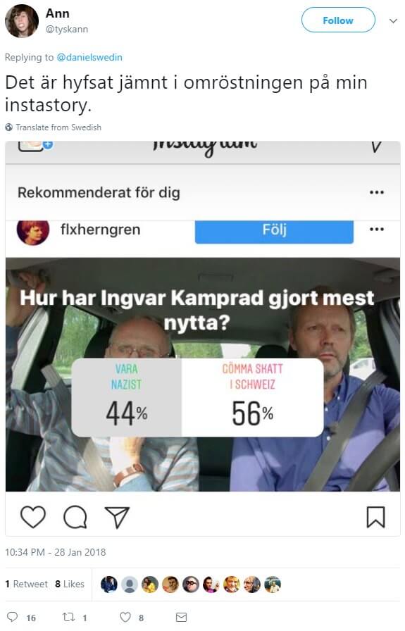 På Twitterkontot @tyskann har en skärmdump publicerats med en bild på Kamprad där han åker bil tillsammans med tv-profilen Felix Herngren. Över bilden ställs frågan ”Hur har Ingvar Kamprad gjort mest nytta?” med två svarsalternativ: ”Vara nazist” och ”Gömma skatt i Schweiz”. Omröstningen har skapats med hjälp av tjänsten Instastory från samma användarnamn som det på Twitter. Den har gillats av flera personer, bland dem Aftonbladets ledarskribent Daniel Swedin.