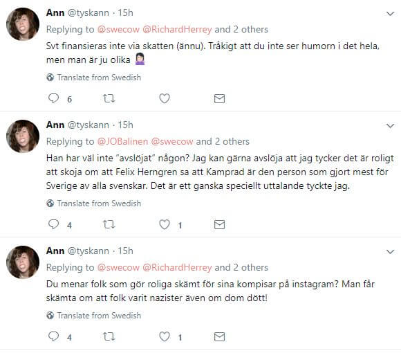 Ann Edliden lägger upp sitt inlägg vid halv elva-tiden på söndagskvällen. När hon möter kritik för attacken på den nyligen avlidne Kamprad skriver hon ytterligare tre Twitterinlägg där hon försvarar sig.