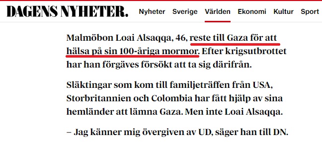 Statstelevisionen och Dagens Nyheter har ryckt ut för en ”Malmöbo” som ”åkte till Gaza för att hälsa på sin 100-åriga mormor” men nu är fast där. Palestiniern kräver att svenska skattebetalare ska ordna hans resa till Sverige. Samnytt kan berätta att Malmöbon är fast i sitt hemland där han frekvent vistas och även arbetar som diplomat åt president Mahmoud Abbas. Samtidigt som palestiniern hävdar att han besöker sin mormor – skrev han på Facebook år 2018 att mormorn har gått bort.