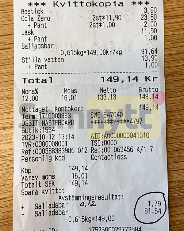 Det pris poliskvinnan egentligen borde ha betalat är nästan 90 kronor högre: 91 kronor och 64 öre för 615 gram sallad.