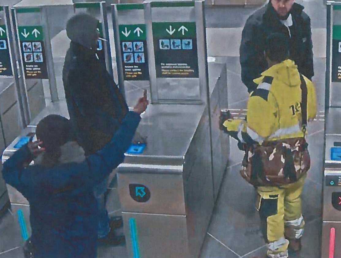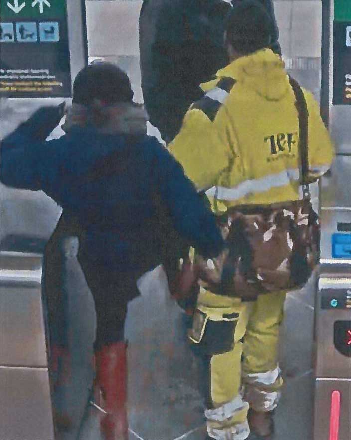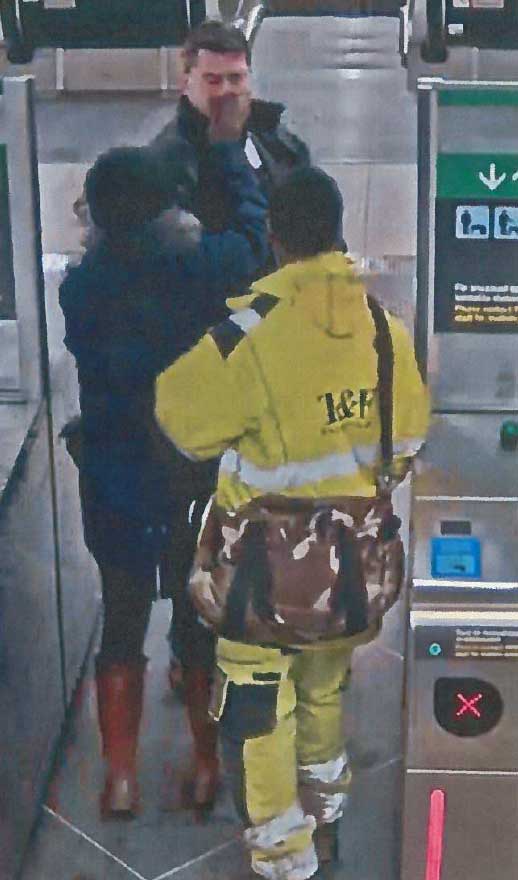 17.30.46 Målägande ”blippar” sitt kort för att passera spärren, precis efter honom kommer den misstänkte och tänker gå igenom spärren utan att ”blippa” sitt egna kort. Målsägande stannar då han passerat och vänder sig om mot den misstänkte och ser ut att tilltala henne. Misstänkt ser ut att ändå försöka tränga sig förbi målsägande, hon håller emot dörrarna så att de inte ska stängas. Det ser ut som om de tilltalar varandra. Misstänkt står kvar mellan dörrarna och försöker ta sig förbi, målsägande stoppar henne. Misstänkt tar tag i målsägandes jacka och sparkar med sitt högra ben mot målsägande och trycker samtidigt bort honom. Målsägande trycker tillbaka henne och in genom spärrarna, misstänkt snubblar till men faller aldrig ner på marken. En allmänhet (man i gul jacka) kommer och går emellan målsägande och misstänkt. Misstänkt ställer precis bakom mannen i jul jacka och fortsätter att hålla upp spärrarna.