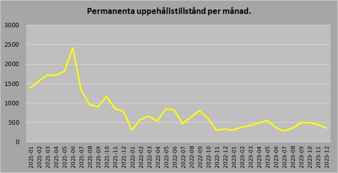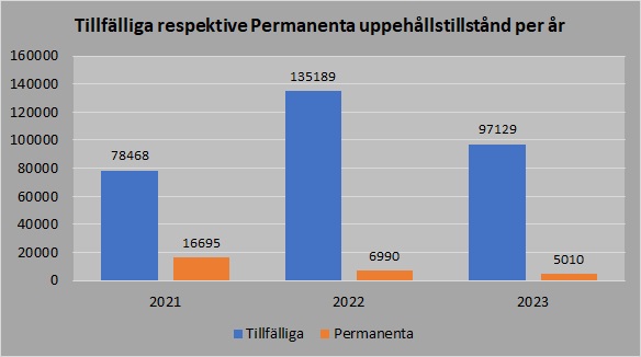 Man kan se att det skett en relativt kraftig förskjutning från permanenta till temporära uppehållstillstånd. Men den trenden inleddes redan under senare delen av 2021 efter att den dåvarande S-regeringen beslutat att tillfälliga uppehållstillstånd ska vara huvudregel för asylsökande.