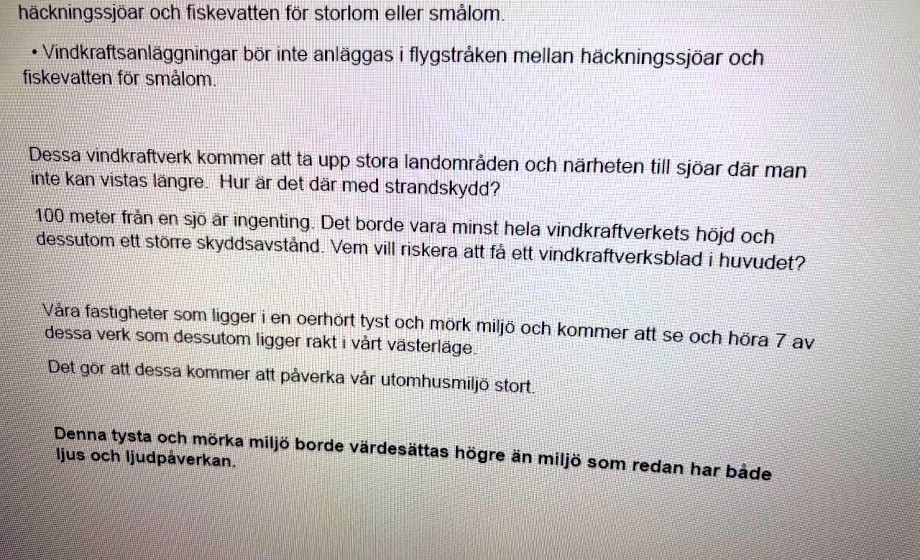 ”Våra fastigheter som ligger i en oerhört tyst och mörk miljö och kommer att se och höra 7 av dessa verk som dessutom ligger rakt i vårt västerläge. Det gör att dessa kommer att påverka vår utomhusmiljö stort.”