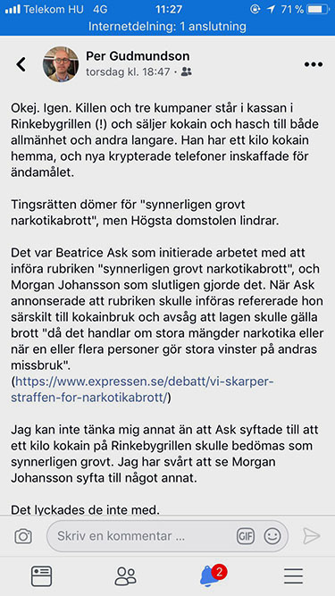 Nyligen gick HD emot lägre instanser i ett fall där tre personer handlat i parti med tunga automatvapen och för detta dömts för synnerligen grovt vapenbrott, en brottsrubricering som infördes 2014 i spåren av en kraftig ökning av olagliga vapen bland gängkriminella. Brottet var enligt HD inte tillräckligt grovt och brottsrubricering och påföljder mildrades. Nu har HD fattat motsvarande beslut i ett mål om narkotikabrott där man anser att brottsrubriceringen ”synnerligen grovt brott” inte är tillämplig.