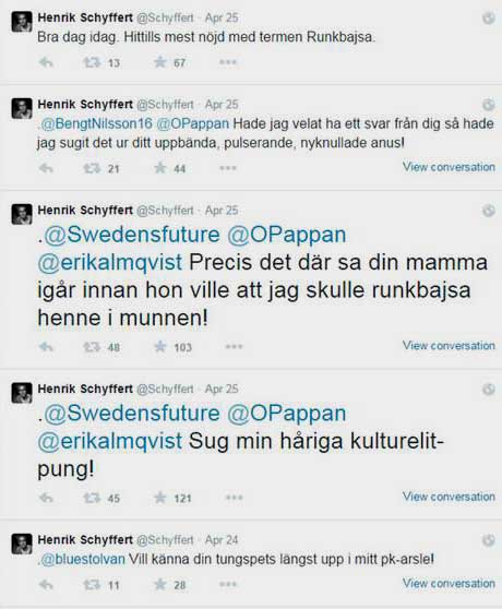 Schyffert uppmärksammades bland annat stort för sina retoriska färdigheter när han i kanalen Twitter för en tid sedan förklarade sig nöjd med att ha berikat det svenska språket med en ny kombinationsterm och berörde många människor med flertalet variationer i hur man kan använda olika könsord.