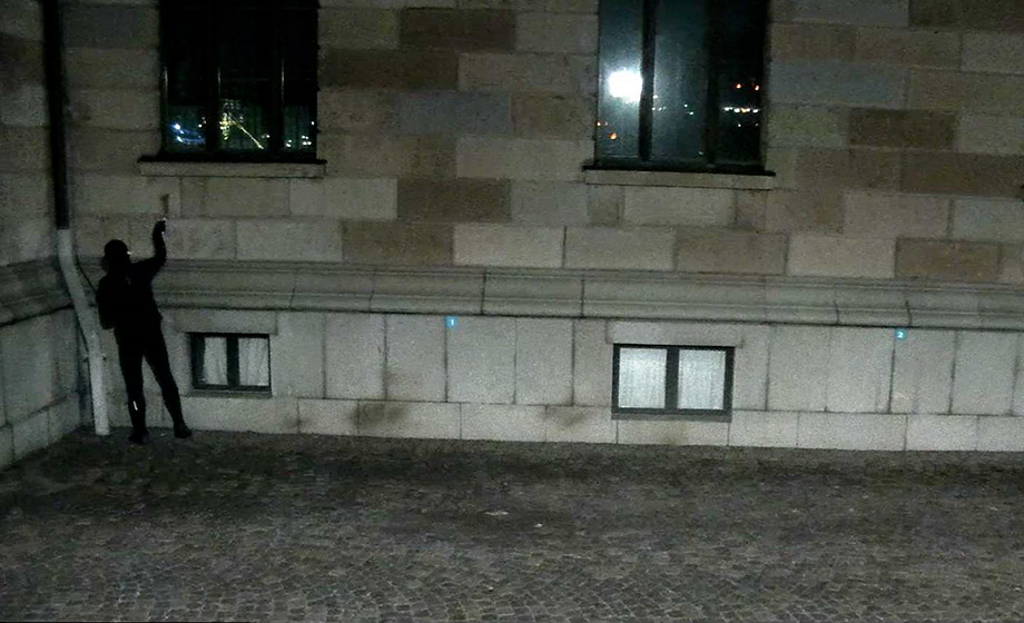 Det är en värmekamera vid Nationalmuseum som larmar, och när en väktare upptäcker den 55-årige liberalens klotterattack mot fasaden ringer denne polisen. Selimivoc grips i närheten, med en ryggsäck med färgburkar på sig.