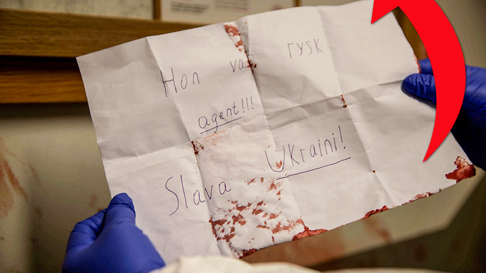 På golvet och marken utanför bostadshuset hittas två lappar med märkliga budskap. ”Hon var rysk agent!!! Slava Ukraini!”, står det på ena lappen. ”De var ryska agenter!!! Slava Ukraini!”, står det på den andra.