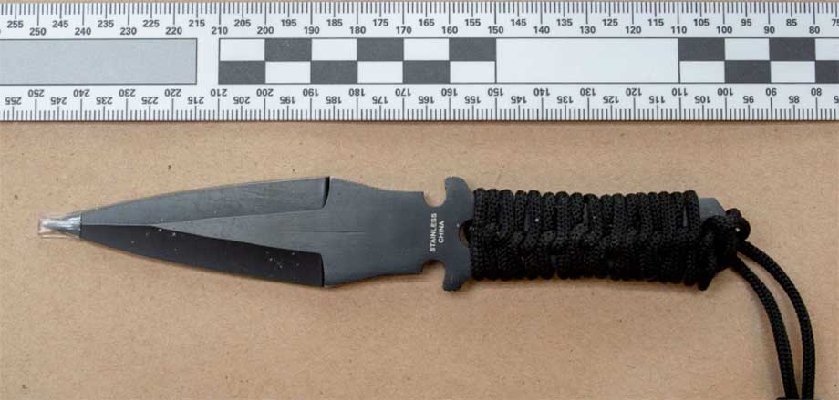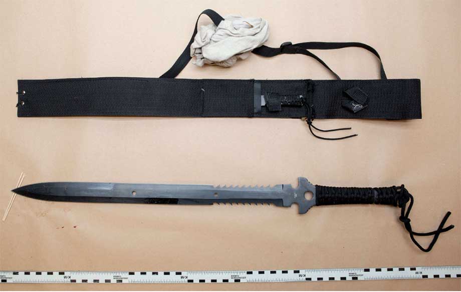 Vid visiteringen påträffades enligt förundersökningen utöver svärdet även två stycken knivar och en pistol. I åtalet uppges avvikande tre knivar samtidigt som pistolen inte omnämns.