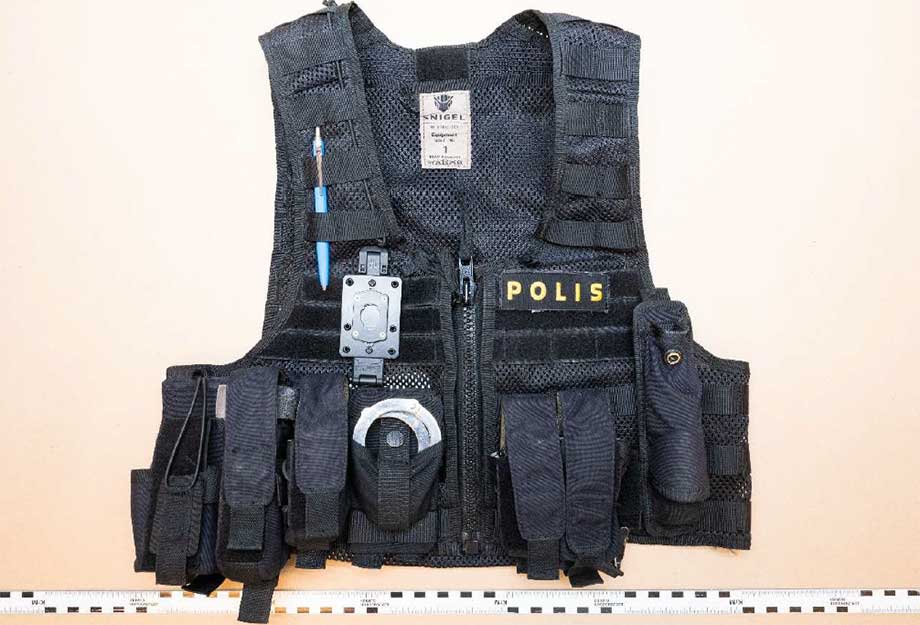 Vid husrannsakan hemma hos mannen påträffades flera falska alternativt olagligt åtkomna polisuniformspersedlar. Där fanns också ett antal blodiga klädesplagg med kulhål som han inte kunnat förklara.