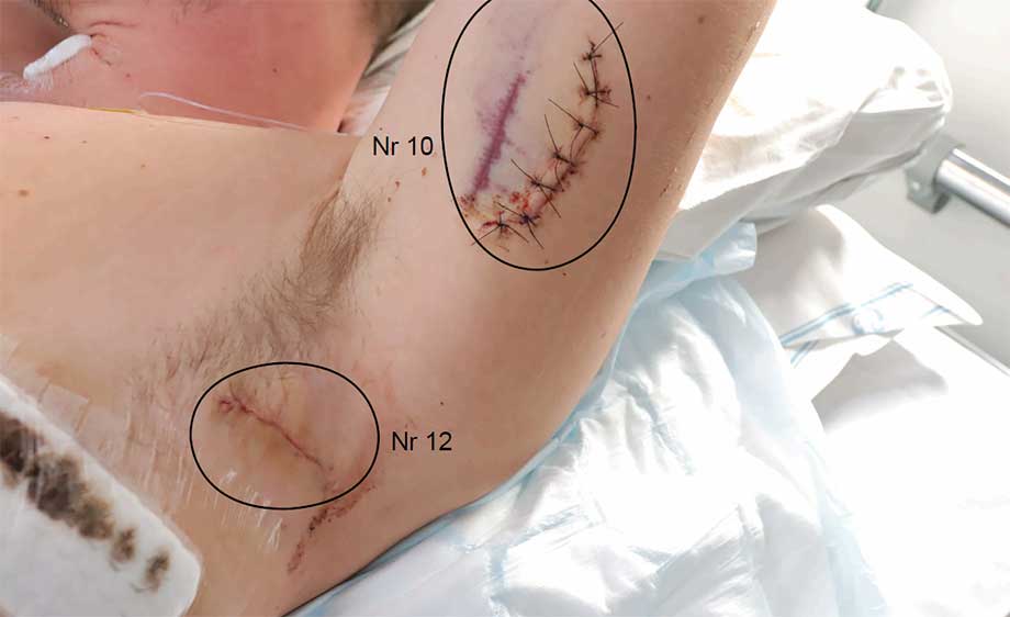 En av poliserna mottog ett hugg rakt i bröstet som trängde så långt in att det punkterade lungan. Om han inte snabbt kommit under vård skulle han avlidit av skadorna. Den andra polisen fick motta ett hugg över armen och skadades mindre allvarligt.