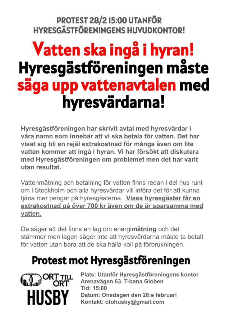 I veckan samlades en grupp personer som är hyresgäster hos Victoriahem i Järva utanför Hyresgästföreningen Region Stockholms kontor. Där protesterade man mot vattenräkningarna och kräver att det ska vara gratis. Systemet infördes efter att man märkt av en ovanligt hög vattenkonsumtion i området.