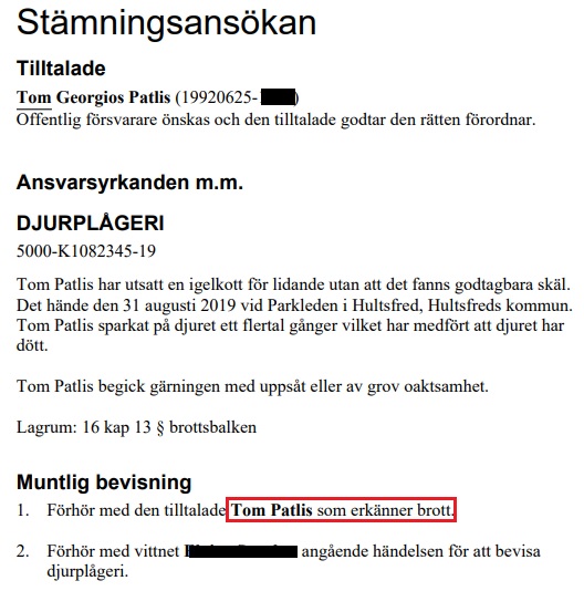 Samhällsnytt har tagit del av förundersökningsprotokollet och stämningsansökan från Kalmar tingsrätt. Där framgår att 28-årige Tom Patlis folkbokförd i Vimmerby åtalas för djurplågeri och åklagaren menar att han begick gärningen med ”uppsåt eller av grov oaktsamhet”.