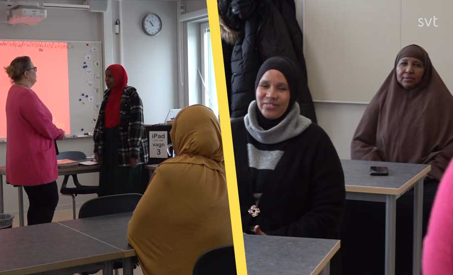 SVT:s reporter Aina Olsson är inne på samma linje i ett filmat inslag, där hon pratar med kameran samtidigt som hon catwalk-går genom korridorer och klassrum där det annars studeras SFI men som inför SVT:s besök tömts på elever.