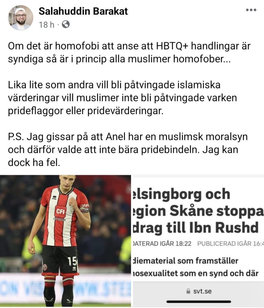 I ett inlägg på sociala medier kommenterar imamen Salahuddin Barakat en fotbollsspelares val att inte iklä sig kaptensbindel i regnbågens färger. Att vara homofob, som fotbollsspelaren anklagats för, menar han är en del av att vara muslim.