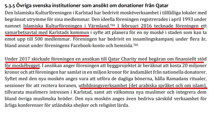 Den 22 april förra året uppmärksammade Försvarshögskolan att Islamiska kulturföreningen med Rauf Ahmadi i spetsen har sökt bidrag från Qatar. Det framgår av Försvarshögskolans rapport att det handlar om pengar från Qatar charity – som uppges ha en odemokratisk religiös agenda.
