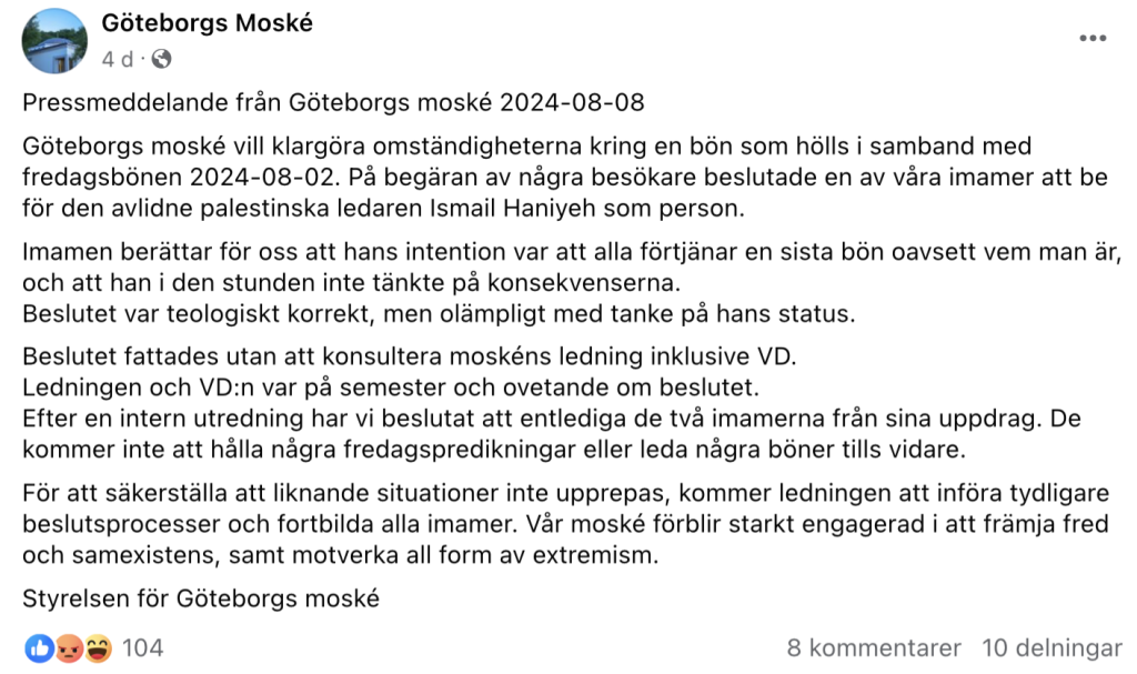I början av augusti uppmärksammades det att en imam i Göteborgs moské höll bön för Hamas-ledaren Ismail Haniyeh som dödades i Iran. Efter medieuppmärksamheten lät moskén meddela att imamen ”entledigats” och enbart ”tills vidare”. Samtidigt visar en granskning att imamen har stort inflytande i Sverige och kopplas till Muslimska brödraskapet men även Socialdemokraterna.