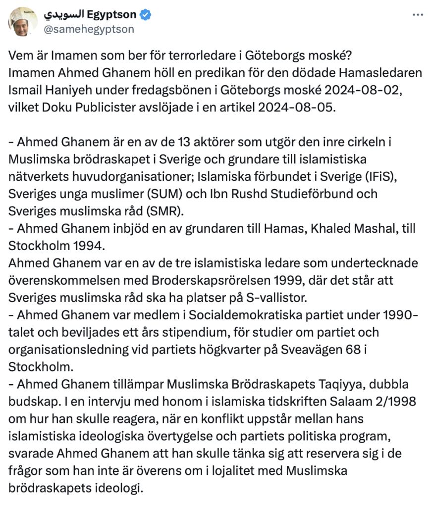 Sameh Egyptson är forskare och har under flera år kartlagt hur Muslimska brödraskapet ska ha infiltrerat både organisationer och politiska partier i Sverige. I ett nytt inlägg på sin blogg ’Sanningen framför allt’ har Egyptson framfört att Göteborgs-imamen Ahmed Ghanem är grundare av Muslimska brödraskapets gren i Sverige.