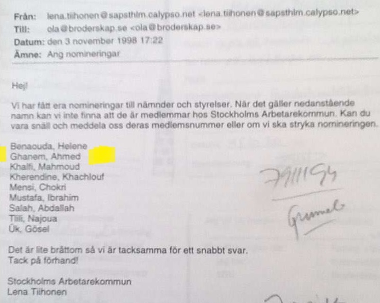 Enligt Egyptson har Ahmed Ghanem en bakgrund inom Socialdemokraterna. Det var Socialdemokrater för tro och solidaritet (STS) (även kallad Socialdemokratiska broderskapsrörelsen) som ska ha nominerat Ghanem till förtroendeuppdrag efter valet 1998.