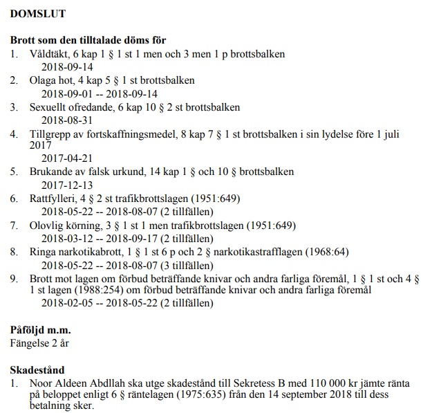 Döms även för lång rad andra brott Domen mot Noor innefattar vid sidan av våldtäkten även en rad andra brott: tillgrepp av fortskaffningsmedel, brukande av falsk urkund, rattfylleri, olovlig körning, narkotikabrott samt brott mot knivlagen.