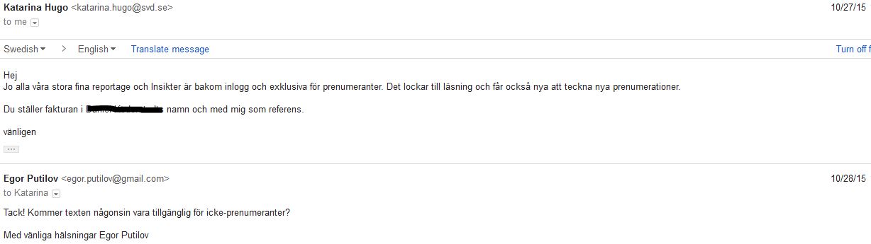 Det lockade förstås ingen till läsning. Min fråga om huruvida artikeln någonsin i framtiden kommer att vara tillgänglig för läsarna lämnades utan svar.