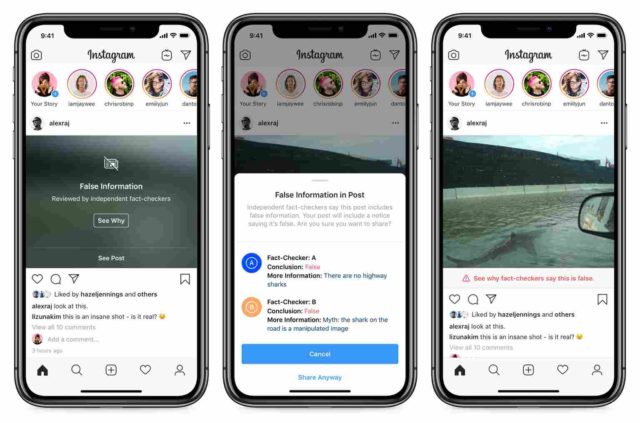 Instagram ska utöka sina faktakontrollerande tester i USA och kommer att arbeta med 45 tredjepartsorganisationer för att utvärdera sanningshalten i foto- och videoinnehåll i sin app. Material som bedöms vara falskt kommer att döljas från sidan ”utforska” och från hashtag-sidorna. Bilder och videoklipp kommer även att täckas med en varning som blockerar innehållet i flödet eller berättelser tills användarna trycker på varningen för att kunna se inlägget i sin helhet.