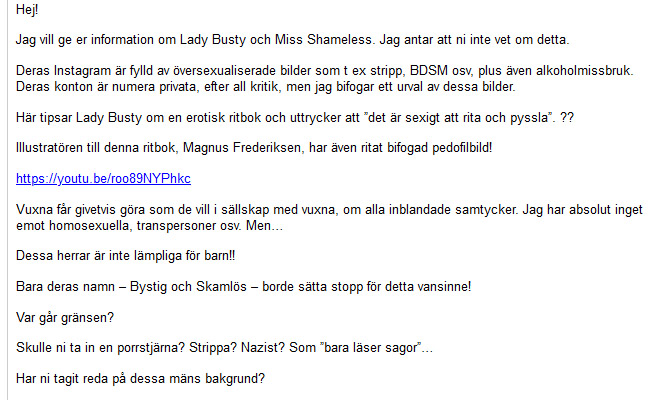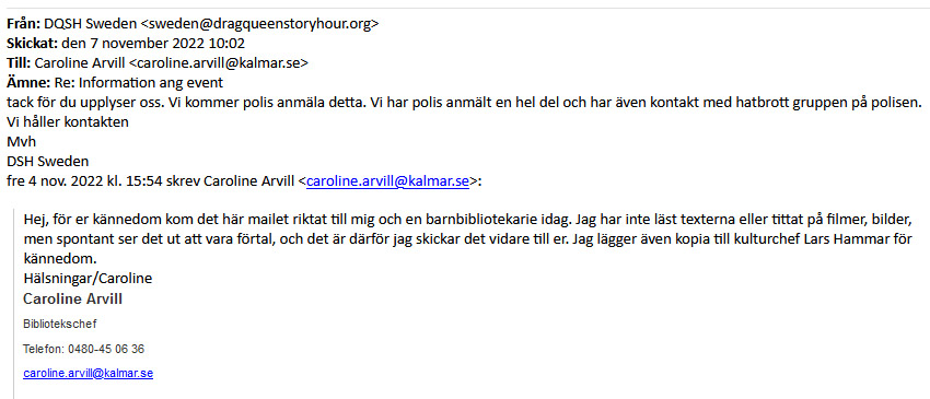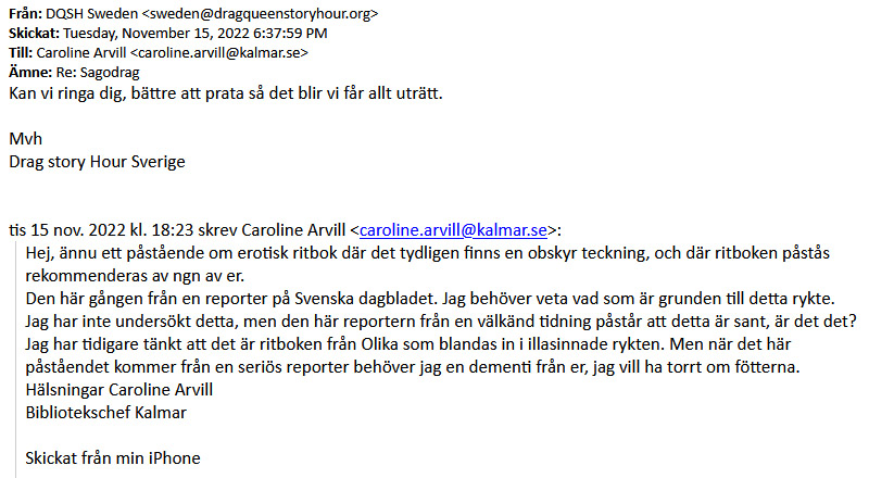 Av mejlkorrespondens Samnytt tagit del av framgår även att bibliotekschefen i Kalmar vägrar tro att ”Miss Shameless Winehore”, som kommunen anlitat för att läsa sagor för barn, rekommenderat en ”erotisk ritbok”.