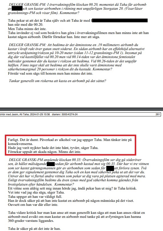 Taha påstår sig inte minnas händelsen så noga och förnekar brott med hänvisning till att han inte haft uppsåt att skada någon och att han i sitt berusade tillstånd inte förstod att det skulle bli konsekvensen av att kasta in en kraftig sprängladdning i en folksamling.