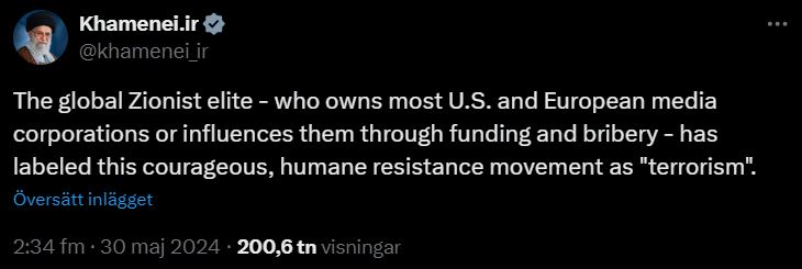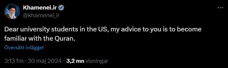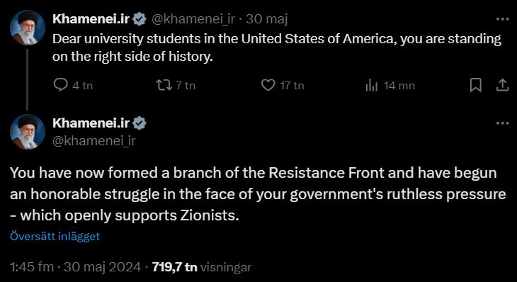 I uttalanden på sociala medier tackar Irans högste andliga och politiska ledare, ayatolla Ali Khamenei, de studenter som genomför pro-palestinska demonstrationer. Studenterna, som inte sällan är extremt politiskt korrekta, har förenats med islamistdiktaturen i sitt hat gentemot Israel och judar.