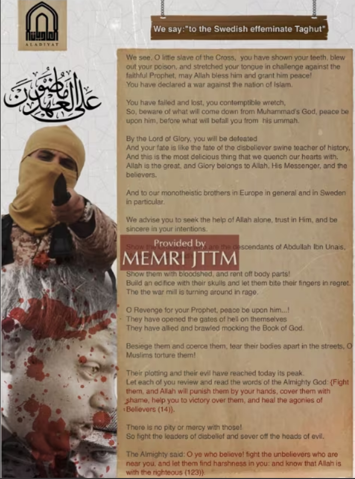 Det är mediekanalen Al-Adiyat som i mitten av mars delade ett inlägg med uppmaningar om våld mot svenskar. Detta efter den dansk-svenske politikern Rasmus Paludans koranbränningar.