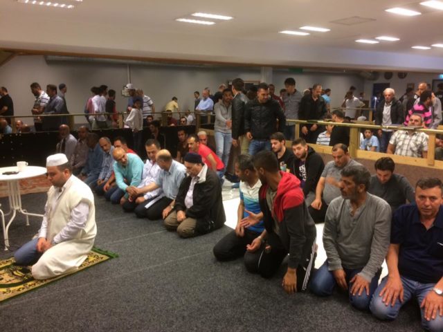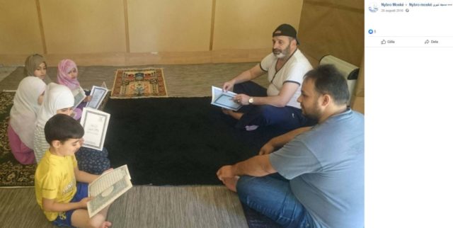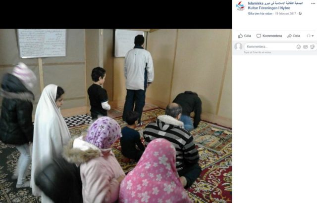 Bön hos Islamiska kulturföreningen i Nybro. Inga kvinnor syns till i lokalen. Faksimil Facebook.
