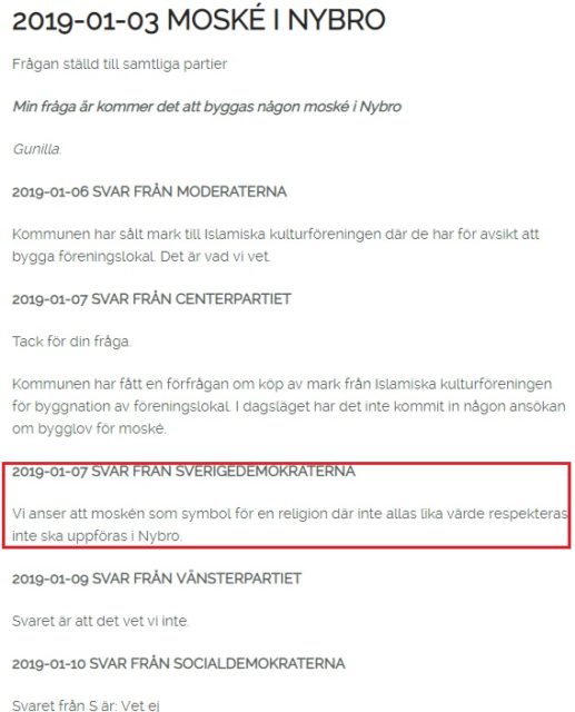 Ett par månader senare, i januari 2019, fick kommunpolitikerna en fråga från kommuninvånaren ”Gunilla” om det kommer att byggas någon moské i Nybro. Men ingen kunde då ge något besked hur den islamiska föreningen har tänkt att använda lokalen.