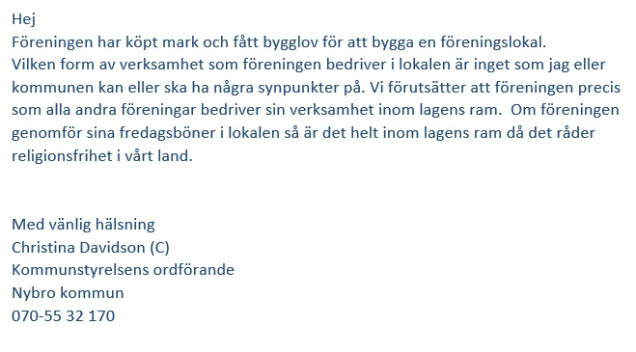 SD-politikern konfronterade kommunledning Den tidigare riksdagsledamoten kontaktade kommunstyrelsens ordförande och vice ordförande i Nybro för att fråga om de upplevde den islamiska kulturföreningens beviljade bygglovsansökan som en föreningslokal eller som en moské. Han fick följande svar: