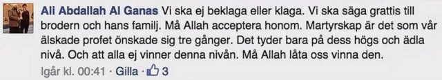 Al-Ganas kommenterade en av männens bortgång ett inlägg på Facebook. Enligt förskolläraren skulle man ”ej beklaga eller klaga”. Man skulle istället ”säga grattis brodern och hans familj” eftersom han blivit martyr.
