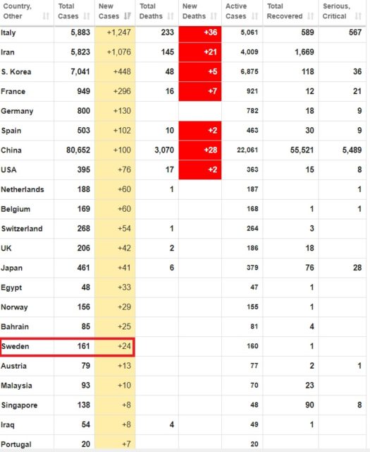Enligt Worldometers sammanställning växer smittan i rask takt på den europeiska kontinenten. Vid sidan om Italien ser även Frankrike, Tyskland och Spanien anmärkningsvärda ökningar av smittade. I Sverige har det hittills bekräftats 161 fall. Det är oklart hur många av dessa som befinner sig i kritiskt eller livshotande tillstånd.