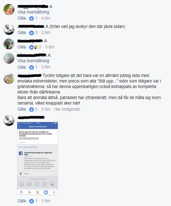 Det finns även skärmdumpar från interna diskussioner i gruppen vid massanmälningar där det till exempel skrivs bokstaven A. I kommentarer. Med ”A” menas ”anmält” – att den här personen eller inlägget alltså är anmälda till Facebook.