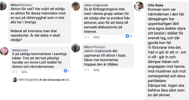 ”Vad vi gör är att vi – om vi vill – går in och dämpar ilskan och angreppen mot henne, mot muslimer och mot centerpartiet och dess ledare”, förklarar gruppens moderator Cilla Wyke.