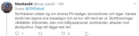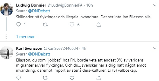 En annan person tydliggör att ”svenskar aldrig har haft något emot invandring, däremot import av stenålderskulturer. Er (S) valboskap”. Medan fler andra undrar vilken verklighet som toppdiplomaten lever i.