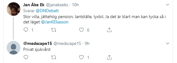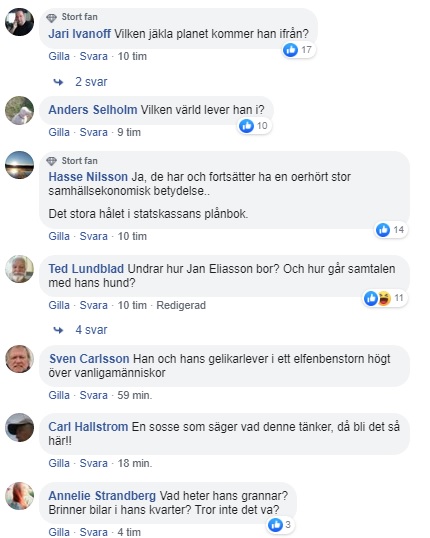 ”Vilken jäkla planet kommer han ifrån?” I sociala medier rasar många mot Eliassons debattartikel. En person skriver, ”stor villa, jättehög pension, landställe, lyxbil. Ja det är klart man kan tycka så i det läget.”.