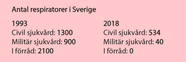 Nu visar det sig dessutom att svensk kapacitet att hantera kritiska coronafall är nära tio gånger sämre än innan sekelskiftet. Tillgången till respiratorer både inom den civila sjukvården och militären har minskat drastiskt.