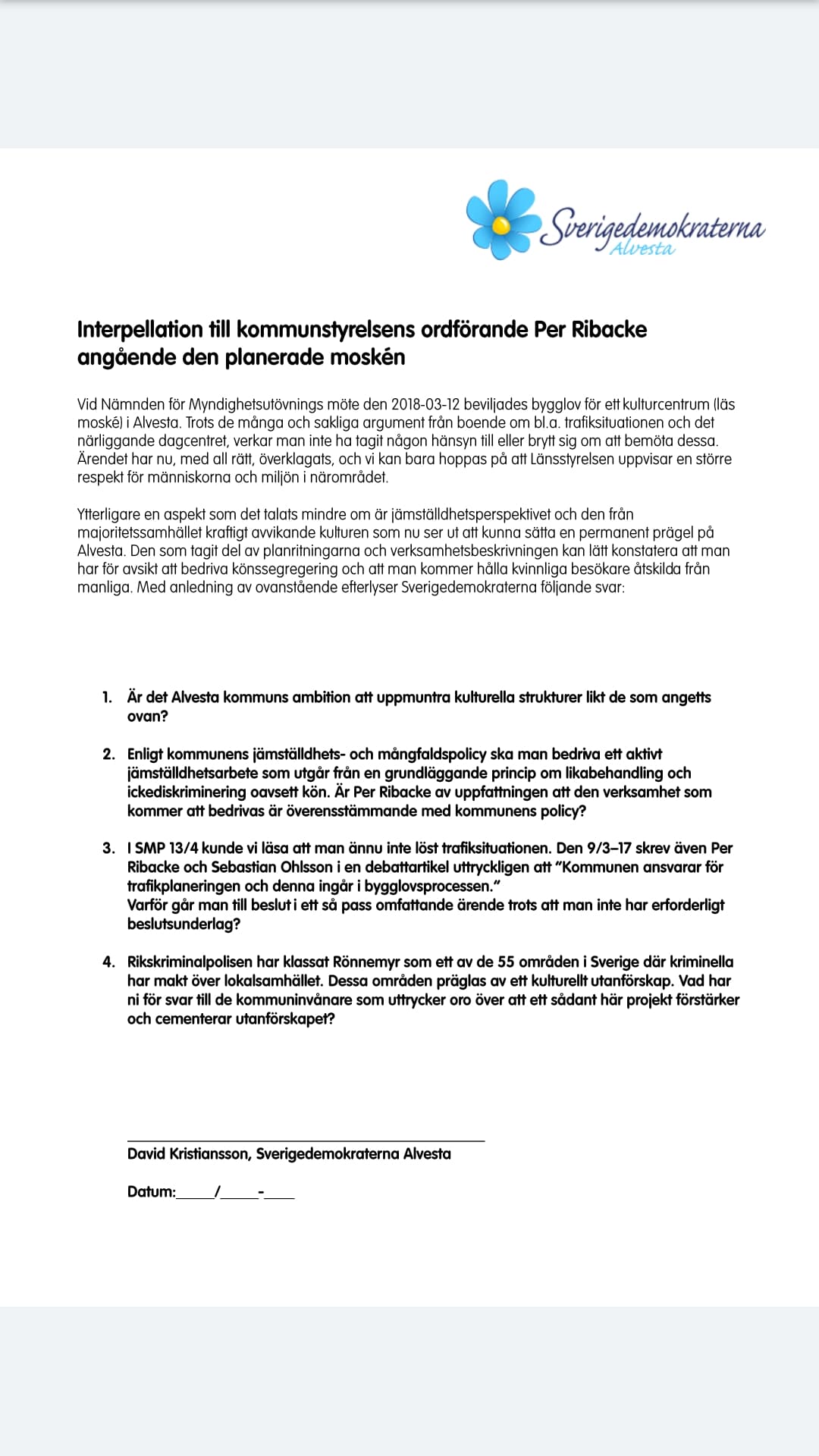 SD emot bygget Hela bygget beräknas kosta 15 miljoner kronor och kommer kunna ta emot 500 personer samtidigt. Förutom moské kommer byggnaden även innehålla bibliotek och fritidsgård.