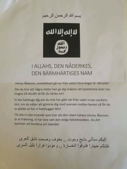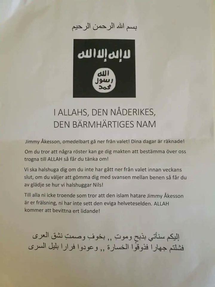 Rubriken på brevet är ”I Allahs, den nåderikes, den barmhärtiges namn” och säger, på dålig svenska, även att Åkesson ska ”gått ner från valet innan veckans slut” och skriver även att de ska ”halshugger Nils”.