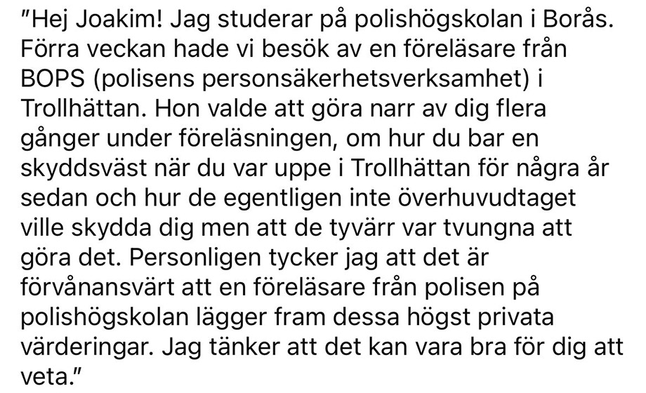 – Jag lägger inte så mycket värderingar i det själv, men det är väl intressant att få en insyn i vad som sker bakom kulisserna på polishögskolorna i Sverige. Det kan vara ett intressant diskussionsämne hur föreläsare på polishögskolan uttrycker sig. Om det är lämpligt att vädra egna åsikter eller inte. Det kanske är jättelämpligt. Det får andra avgöra, säger han.