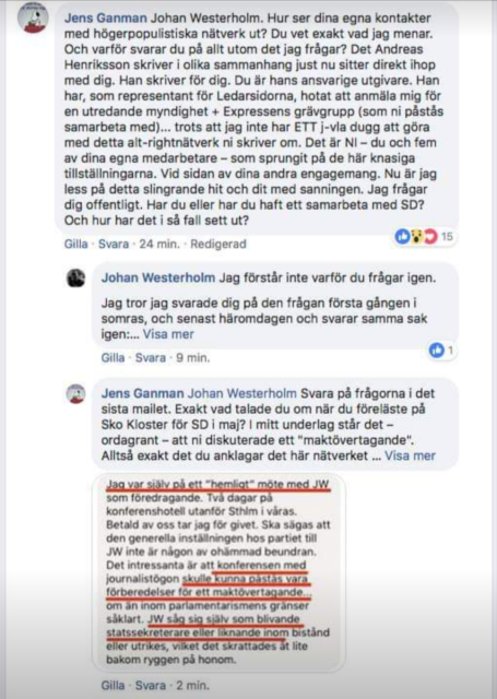 Författaren försökte även att få Andreas Henriksson som har skrivit de kritiserade artiklarna att svara på frågorna om samröre med SD. Men istället för att svara valde Henriksson att hota anmäla Ganman till Expressens grävgrupp för att bli uthängd och se till att en myndighet ”utreder” honom.