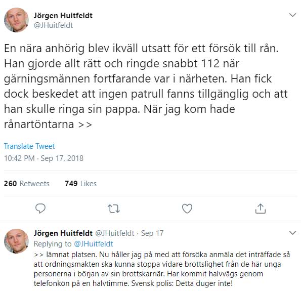 Jörgen Huitfeldt, välkänd utfrågarjournalist från Sveriges Radio, numera på den populistiska sajten Kvartal, gick häromdagen ut på Twitter och berättade om att hans son blivit rånad av ett gatugäng i en Stockholmsförort. Huitfeldt riktade samtidigt skarp kritik mot polisen för att dels ha sagt nej till att rycka ut till brottsplatsen och dels för att ha oacceptabelt lång telefonkö till sitt nummer för polisanmälan av brott.