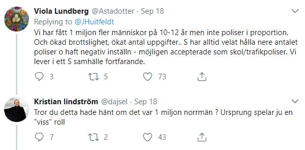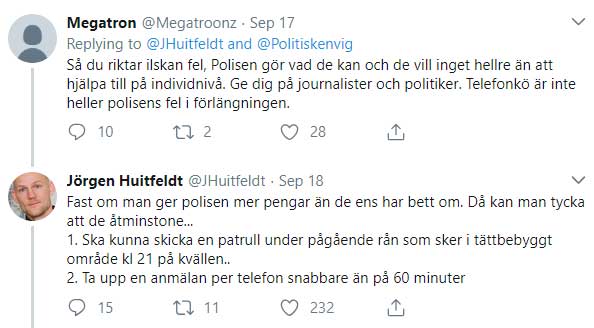 Han får samtidigt mothugg av andra på Twitter om att rikta sin ilska åt fel håll. Signaturen Megatron skriver att Huitfeldt i stället borde kritisera politiker och journalister, som underförstått är de som bär ansvaret för dagens situation med ökad otrygghet på gator och torg och en poliskår som går på knäna till följd av överbelastning.