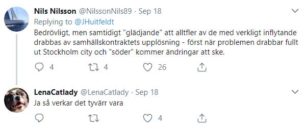 Nils Nilsson förfäktar i diskussionen talesättet ”inget ont som inte har något gott med sig” och menar att först när människor med inflytande och en röst i den offentliga debatten drabbas, kan någon förändring ske. Han får medhåll från signaturen LenaCatlady.