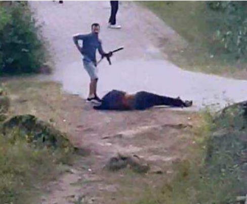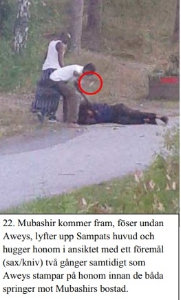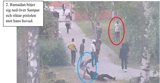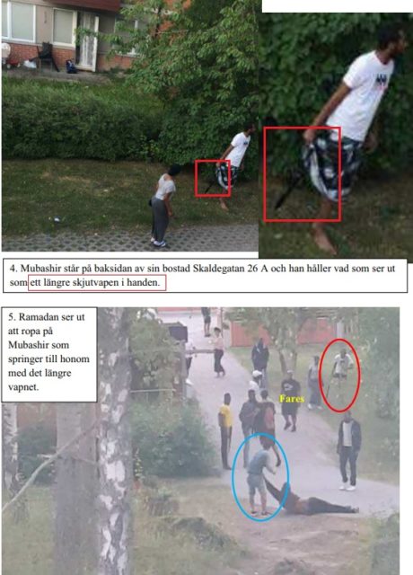 Bilderna nedan från Polisens förundersökningsprotokoll visar hur en person bär på både automatvapen och pistol. I en annan scen hugger en av de misstänkta ett brottsoffer med sax i ansiktet.